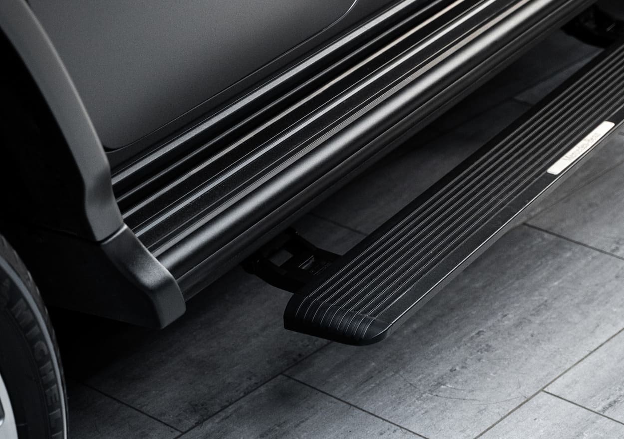 На G-class можно установить два вида электропорогов – короткие и длинные. Если боковой выхлоп отсутствует, то можно установить длинную версию панелей для передних и задних пассажиров. При наличии бокового выхлопа возможна установка только коротких панелей. Подножки полностью убираются под кузов автомобиля и оборудованы датчиком Холла, это значит, что автоматически остановятся, если возникнет препятствие. Мощная силовая конструкция позволяет выдержать до 230 кг веса, управление с приложения в телефоне, установка в штатные места (автомобиль полностью сохраняет гарантию производителя).